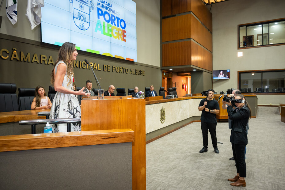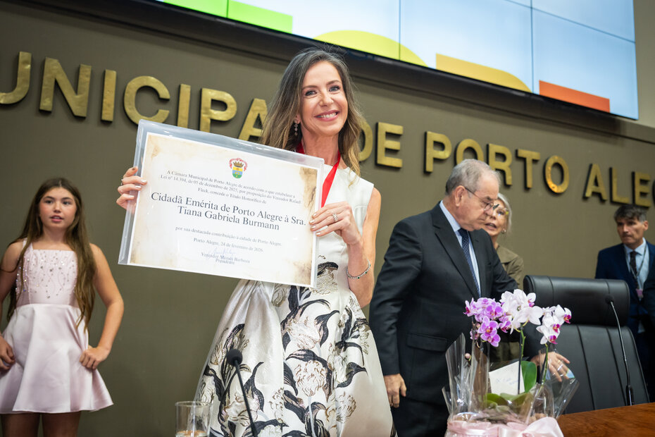 A médica Tiana Burmann, do Instituto Burmann e Bastos, foi homenageada, na noite de terça-feira (24), durante uma sessão na Câmara Municipal, onde recebeu o título de Cidadã de Porto Alegre. A honraria foi uma proposta do vereador Rafael Fleck — atualmente nomeado Secretário Municipal de Serviços Urbanos — pela contribuição de Tiana à Medicina e ao cuidado de pessoas, além de sua atuação em projetos sociais na cidade.